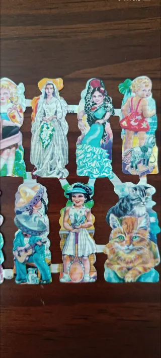 Lámina de cromos troquelados de la marca EVA nº 155 Contiene varias figuras. - Figuras de perros. - Figuras de mujeres vestidas. - Figuras de niños. - Figuras de gatos. Recuperada de álbum, brillo