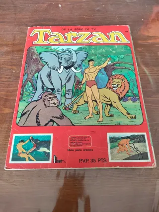 Álbum de cromos de Tarzán, basado en la serie de televisión. Álbum completo de los cromos que salían en los sobres de fher. ( 180 cromos ) . Le faltaría los cromos que salieron en los pastelitos de panrico. Entrega en mano o envío por correo a través de wallapop ( GLS No) Envío perfectamente protegido - Portada a todo color con Tarzán, león, elefante y gorila. - Incluye dos viñetas adicionales en la parte inferior. - Precio original: 35 Pts.