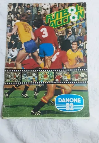 Álbum de cromos de la colección Fútbol en Acción de 1982, patrocinado por Danone. - Es del año de naranjito en España - COMPLETO con sus 96 cromos total y todos los ídolos de entonces. - Aunque solo he puesto buen estado, la verdad es que está muy bien conservado. - Portada con jugadores de fútbol y público. - Logo de Danone 82 en la parte inferior - - Incluye imágenes de partidos y jugadores de la época. - Diseño con tira de película cinematográfica.