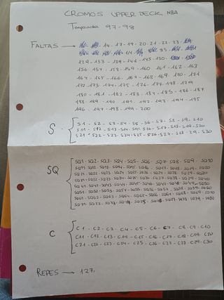 CROMOS NBA UPPER DECK TEMPORADA 97-98 SERIES 1 Cambio o venta de cromos de Nba upper deck. En la última foto esta el listado de repes y faltas. Preferiblemente hago cambios. Según el cromo varia el precio. Precio por unidad NO por lote. *No se vende el album, solo es para orientar que temporada es