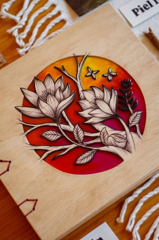 Cuaderno de flores/ álbum de fotos/cuaderno de naturaleza. Está hecho de madera y su encuadernación es japonesa y fuerte, en la portada lleva un dibujo combinado con resina. Sus hojas son de color vainilla, aptas para escribir, dibujar y pegar fotos. Más info por MD