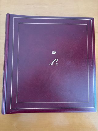 Álbum de sellos del Reinado de Juan Carlos I. Cubierta de color granate con detalles dorados. COLECCIONES COMPLETAS: AÑOS 1975 - 1981 SELLOS NUEVOS !!!!!!!! - Diseño elegante con borde dorado. - Símbolo de corona y letra 'L' grabados. SE ADMITEN OFERTAS