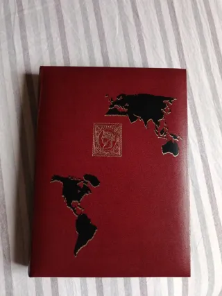 Álbum para coleccionar sellos con diseño de mapas del mundo. - Cubierta de color rojo. - Diseño de mapas del mundo en negro. - Detalle de sello dorado en la portada. -Hay más páginas, en total son 20 todas con sellos