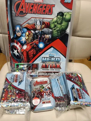 Colección de cartas Marvel Avengers Attax. - Incluye álbum archivador. - Contiene 100 sobres de cartas y una lata metálica. - Ideal para coleccionistas.