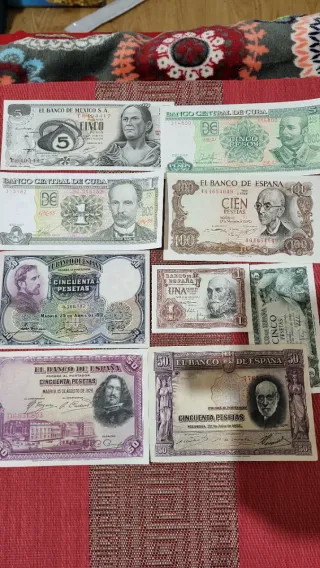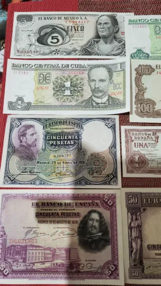 Conjunto de billetes antiguos de diferentes países. - Billete de 5 pesos de México. - Billetes de 5 pesos de Cuba. - Billetes de 100 pesetas de España. - Billetes de 50 pesetas de España. - Billete de 1 peseta de España.