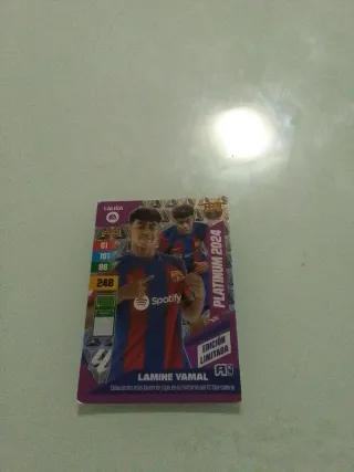 Cromo de La Liga Platinum 2024 de Lamine Yamal. - Edición limitada. - Incluye estadísticas del jugador: 61, 101, 86, 248. - Patrocinado por Spotify. - Debutante más joven en Liga de la historia del FC Barcelona.
