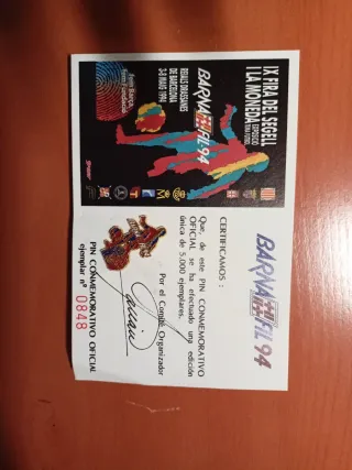 Pin conmemorativo oficial de la IX Fira del Segell i la Moneda Barnafil 1994. - Edición única de 5.000 ejemplares. - Incluye certificado oficial. - Diseño inspirado en el fútbol y el FC Barcelona. - Número de ejemplar: 0848.