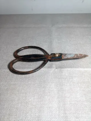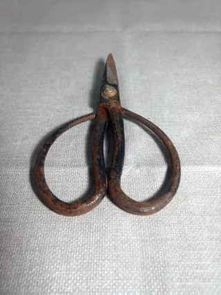 Tijeras antiguas con un acabado oxidado. Peso 70gr. Medidas. 12,5 x 7 cm - Diseño clásico. - Mango curvo.