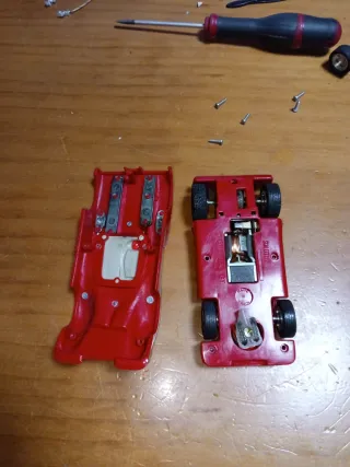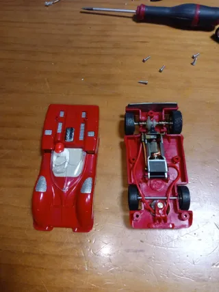 Coche de slot Scalextric Chaparral GT en color rojo. FALTA EL ALERÓN Y NEUMÁTICOS PASADOS NO SE SI FUNCIONA NO LO E PROBADO - Carrocería roja. - Chasis con motor y ejes. - Ruedas delanteras y traseras.