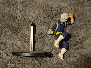 Figura de acción del personaje Todoroki Shoto de My Hero Academia con caja. - Figura detallada con traje azul y blanco. - Incluye efectos de hielo azul en la mano. - Base de exhibición negra con soporte metálico.