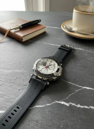 Reloj Tissot con diseño deportivo y elegante. - Correa de caucho negra. - Esfera plateada con detalles en rojo. - Cronógrafo.