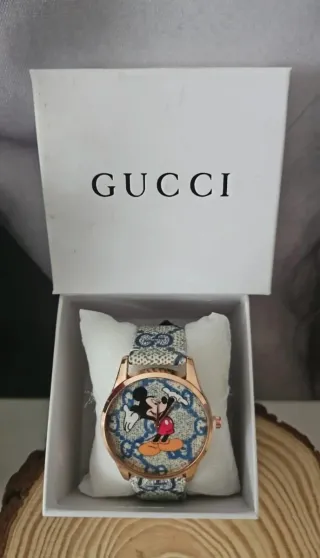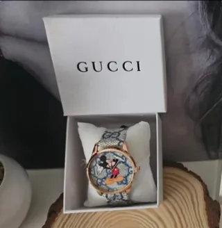Reloj Gucci con diseño de Mickey Mouse. - Correa con estampado GG y Mickey Mouse. - Esfera con imagen de Mickey Mouse. - Caja de reloj incluida.