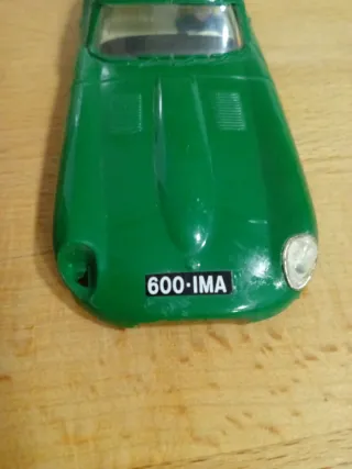 Carcasa de coche de Scalextric, modelo Jaguar E, en color verde. Tiene los tornillos marcados y una grieta en la parte trasera y el piloto delantero que hay está pegado según se ven en las fotos - Diseño deportivo. - Detalle de rejillas en el capó. - Matrícula 600-IMA.