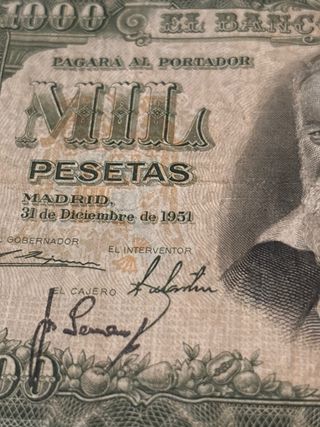Billete de 1000 pesetas del Banco de España con fecha de 31 de diciembre de 1951. - Serie A7564319. - Firma del Gobernador y del Interventor.
