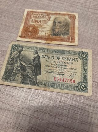 Conjunto de dos billetes antiguos del Banco de España. - Un billete de 1 peseta. - Un billete de 5 pesetas con fecha de 15 de junio de 1945.