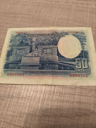 Billete de 50 pesetas del Banco de España, emitido en Madrid el 22 de julio de 1935. - Diseño con retrato de Santiago Ramón y Cajal. - Ilustraciones alegóricas en los laterales. - Firma del interventor y del gobernador.