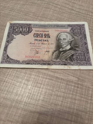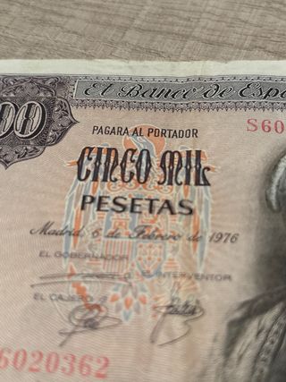 Billete de 5.000 pesetas del Banco de España con fecha de Madrid del 6 de febrero de 1976. - Valor: 5.000 pesetas. - Serie: S6020362. - Año de emisión: 1976.