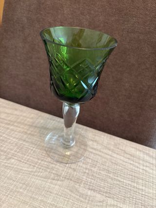 Elegante copa de cristal de color verde con un diseño tallado. - Material: Cristal. - Color: Verde. - Diseño: Tallado.