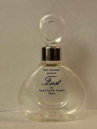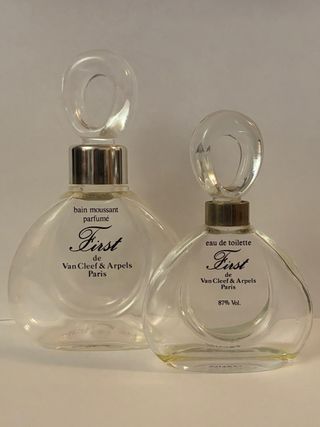 Dos botellas de perfume vacías de la fragancia First de Van Cleef & Arpels, ideales para decoración. - Una botella es bain moussant parfumé. - La otra botella es eau de toilette con 87% Vol.