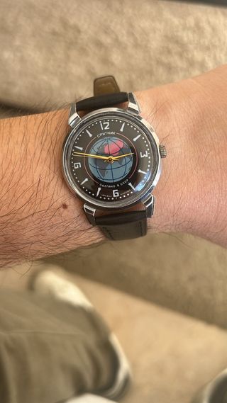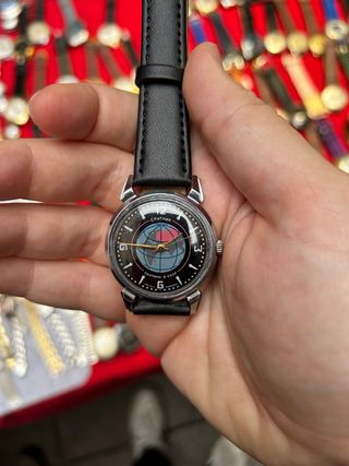 Reloj clásico soviético de la marca Sputnik. Un modelo automático con un diseño distintivo. - Esfera con diseño de globo terráqueo. - Correa de cuero negra.