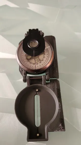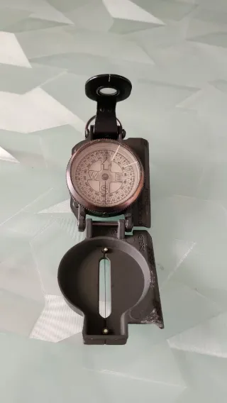 Brújula plegable de estilo militar, con tapa protectora y visor. - Diseño robusto y compacto. - Marcaciones en grados y direcciones cardinales.
