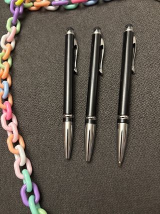 Conjunto de tres bolígrafos de diseño elegante en color negro. Perfectos para uso diario o como detalle especial. - Cuerpo metálico en acabado negro. - Detalles plateados. - Clip metálico para sujetar.