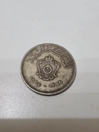 Moneda de 100 Milliemes de Libia del año 1970. - Diseño con escudo y corona. - Inscripciones en árabe y números romanos.