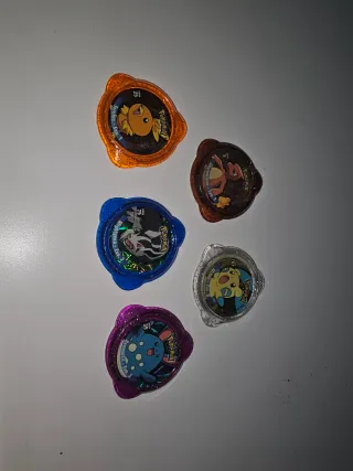 Colección de tazos Pokémon de la marca Panini. Cada tazo tiene un diseño único y colorido. - Tazo de Torchic (Nivel 25) - Tazo de Charmander (Nivel 25) - Tazo de Absol (Nivel 75) - Tazo de Pikachu (Nivel 107) - Tazo de Azumarill (Nivel 39)