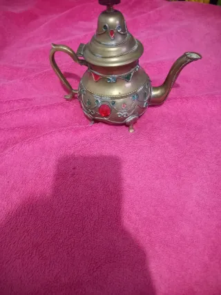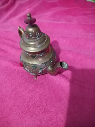 Preciosa tetera árabe, elaborada en latón y con detalles decorativos. - Material: Latón. - Diseño: Tradicional árabe. - Adornos: Incrustaciones de piedras de colores y detalles labrados.