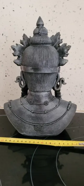 Preciosa figura decorativa de Buda, con un diseño detallado y elegante. - Elaborada con un material que imita la piedra. - Corona y joyas ornamentadas. - Expresión serena.imita a envejecido.Medidas 30 cm de alto por 21 de ancho