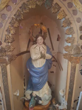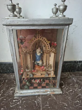 Pequeño altar con figura de la Virgen. - Figura central de la Virgen vestida de azul. - Decoración con flores y detalles dorados. - Base con diseño de tablero de ajedrez.