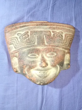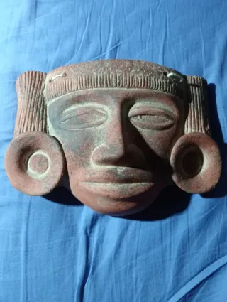 Máscara decorativa de estilo antiguo, ideal para coleccionistas o como pieza de decoración,traída DE México. - Diseño detallado con rostro y figura superior. - Material de terracota o similar. - Tonos rojizos y oscuros.
