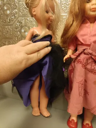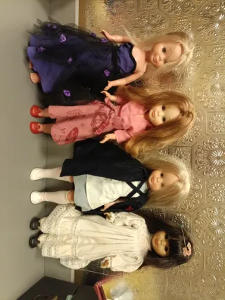 Lote de cuatro muñecas Nancy de los años 70. Incluye diferentes vestimentas y estilos. Dos de tobillo gordo y ojos azules margarita, la enfermera de los 70 con conjunto original de la misma época muy nuevo, la oriental completa y funcionando - Muñeca con vestido morado y negro. - Muñeca con vestido rosa. - Muñeca con capa negra y vestido blanco. - Muñeca con vestido blanco y pelo oscuro.