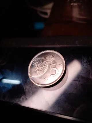 Moneda de 5 pesetas del año 1980 - Diseño con balón de fútbol y escudo. - Canto con greca.))la estrella año 81 3 años en una misma moneda....