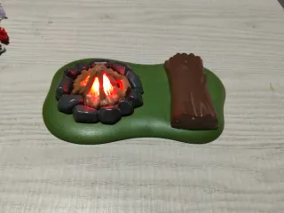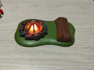 Set de Playmobil que incluye una hoguera con efecto de luz y un tronco. - Base verde con forma de terreno. - Hoguera con piedras y llamas naranjas. - Tronco de árbol marrón.