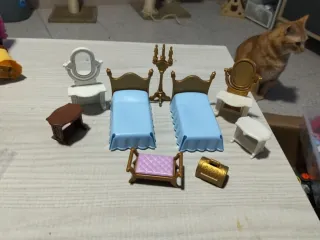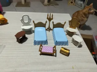 Conjunto de muebles de Playmobil para una habitación de princesa. Incluye dos camas, tocadores y accesorios. - Dos camas con ropa de cama azul. - Tocador blanco con espejo. - Tocador dorado con espejo. - Pequeño banco acolchado. - Cofre dorado. - Mesa auxiliar marrón.