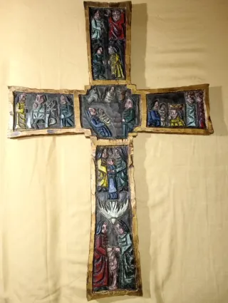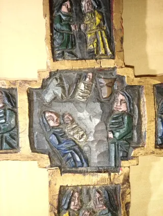 Cruz decorativa antigua, ideal para coleccionistas o como pieza de decoración. - Diseño tallado con escenas. - Acabado dorado en los bordes.