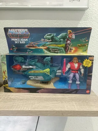 Figura de acción de Príncipe Adam con su Sky Sled de Masters of the Universe. Incluye accesorios. - Figura de Príncipe Adam. - Vehículo Sky Sled. - Accesorios. - Diseño retro.