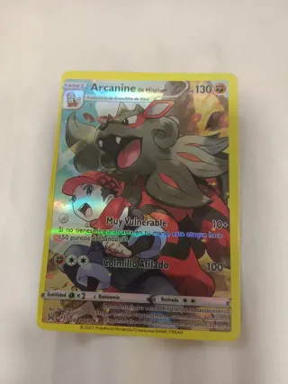 Carta Pokémon de Arcanine de Hisui. - Fase 1. - Evoluciona de Growlithe de Hisui. - Ataque: Colmillo Afilado. - PS: 130. - Debilidad: x2. - Resistencia. - Retirada: **.