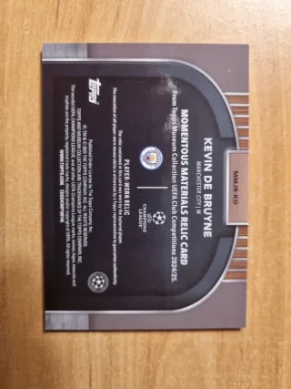 Tarjeta de colección de Kevin De Bruyne, con material Momentous Materials. - Edición numerada. - Incluye fragmento de Momentous Materials. - Jugador: Kevin De Bruyne. - Equipo: Manchester City.