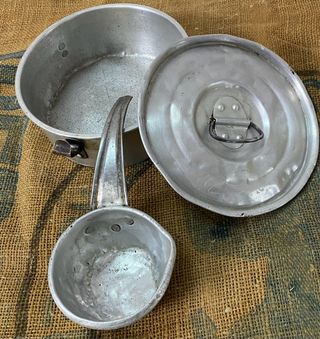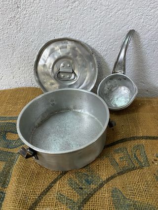 Tartera o fiambrera de aluminio y cazo a juego. Son de principios de 1900 y se conservan en buen estado. La tartera mide 16 cm de diámetro y 6 cm de altura. El cazo mide 8 cm de diámetro y 18 cm de largo. Ideal para decoración rústica o colección. decoración vintage, herramienta antigua, brocante, country style, cottage, atrezzo, siglo xix, 1900, horca antigua, hoz, zoqueta, horquilla decoración, antigüedades, colección, casa rural, bodega, pueblo, decoración rústica, antigüedad, yugo, barzón, hierro fundido, forja, herramientas antiguas, clavos antiguos, gancho, restauración vintage, artesa, bomba manual, bicicleta antigua