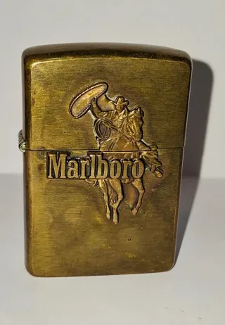 Mechero Zippo con diseño de vaquero y el logo de Marlboro. - Acabado en bronce. - Detalle grabado de un vaquero montando a caballo con un lazo. - Logo de Marlboro en relieve. - ZIPPO N°• X