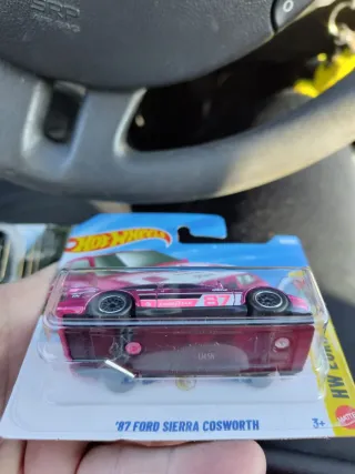 Coche de juguete Ford Sierra Cosworth STH de Hot Wheels. - Color rosa metálico. - Diseño deportivo con detallees blancos y negros. - Neumáticos negros y de goma - Número 87 en el lateral y capó. No mareos
