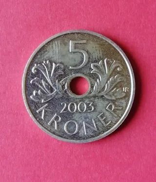 Moneda de Noruega con un diseño circular. Año 2003 - Inscripción KONGE RIKET NOREG alrededor del borde. - Diseño central con motivos ornamentales y un agujero en el centro. No se hacen envíos solo en Murcia y en mano