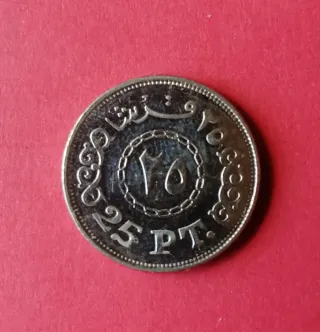 Moneda de Egipto con valor de 25 PT. - Diseño con inscripciones en árabe. - Detalle central con número 25 rodeado por una cadena. No se hacen envíos solo en Murcia y en mano