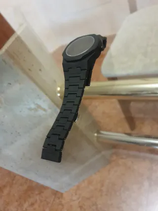 Reloj deportivo con diseño inspirado en Mercedes-AMG. - Esfera negra con detalles plateados. - Correa de metal. - Bisel con marcadores de tiempo.