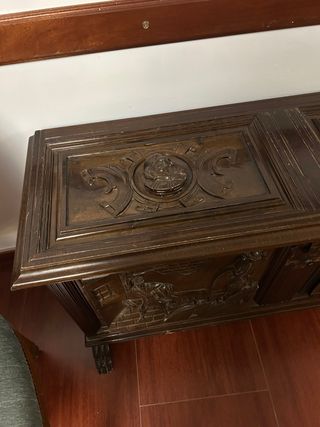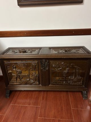 Arca de madera con tallado inspirado en El Quijote. Diseño con escenas talladas en relieve. Se trata de un mueble de madera maciza de estilo toledano. Tapa con bisagras y cierre central con llave. Gran capacidad de almacenaje. Patas ornamentadas. 126x41x65 (largo,fondo,alto) SE ENCUENTRA EN ANTEQUERA