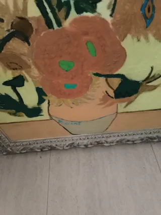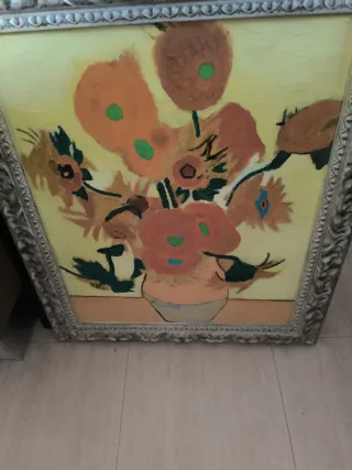 Reproducción del famoso cuadro Los Girasoles de Van Gogh. Una pieza decorativa con colores vibrantes. - Pintura al óleo sobre lienzo. - Marco plateado con detalles. - Tonos amarillos y naranjas predominantes.