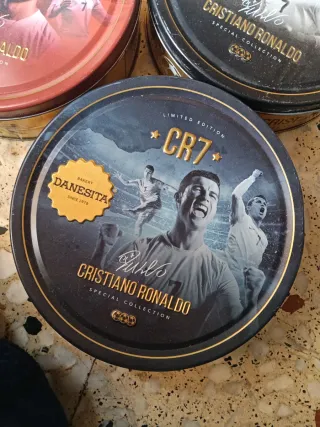 Conjunto de tres latas coleccionables para coleccionistas de fútbol Cristiano Ronaldo ideal para guardar cromos o lo que prefieras. - Edición limitada firmada CR7. - Diseño Danésita galletas - Ilustraciones de Cristiano Ronaldo.