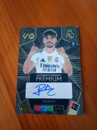 Tarjeta de colección Panini Adrenalyn de Asensio con autógrafo original. - Edición Premium. - Incluye números de estadísticas: 95, 95, 95, 285. - Diseño con fondo negro y detalles dorados.